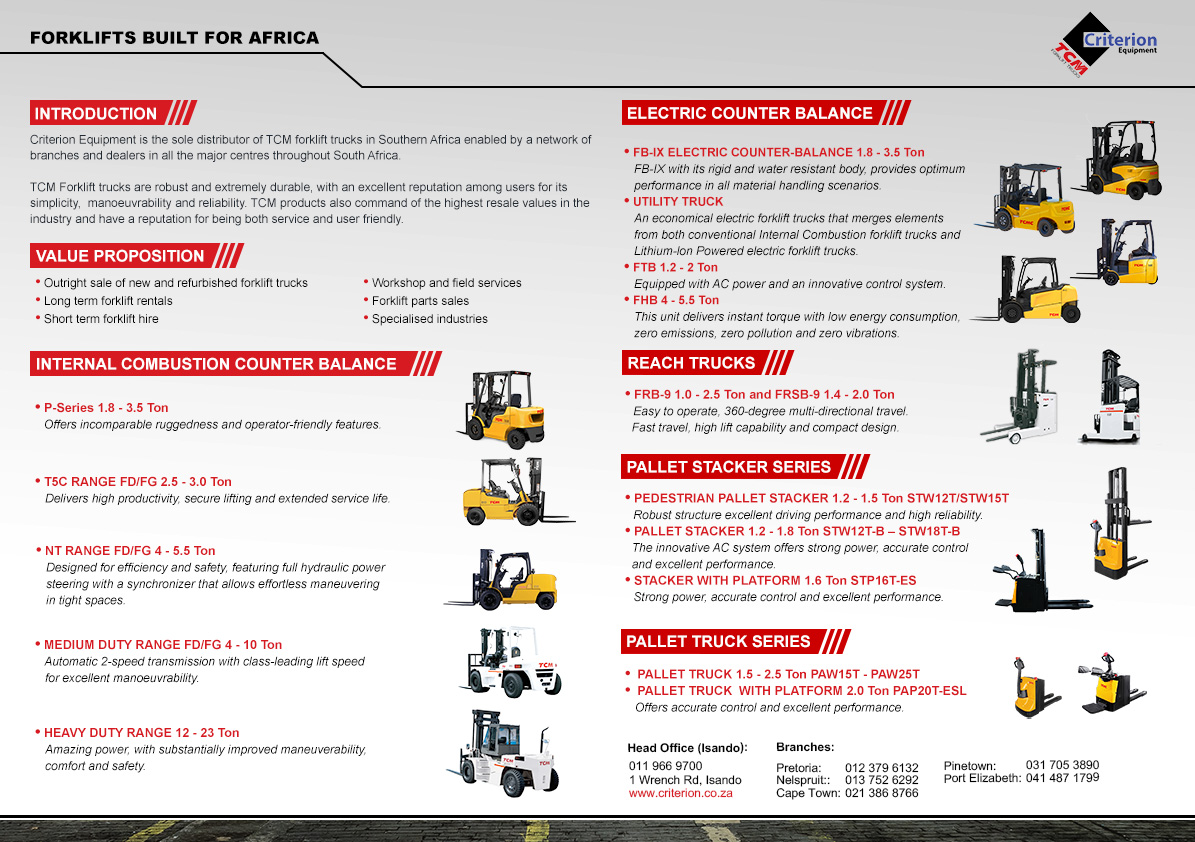 Criterion Equipment, proudly serving as the exclusive distributor of TCM forklift trucks in Southern Africa, operates through a robust and comprehensive network of branches and dealers strategically located across all major centers in the region. This extensive network is designed to ensure that customers, no matter where they are located, have easy and efficient access to the full range of TCM products and services.